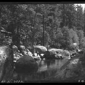 View of an unidentified river; the water level is low and many boulders and rocks are exposed. The river is not specifically identified, but it appears to probably be the upper American. The negative has a hand written date of August 1932.