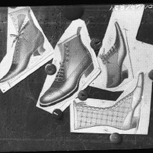 This is a glass plate negative of 4 screened pictures. The 4 pictures are of shoes for a catalog.