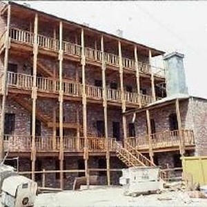 The rear exterior of the Mechanic's Exchange Hotel building during restoration.