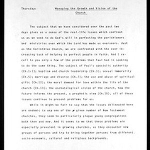 Triad convention & holy convocation, Women's Department, Church of God in Christ, John Wesley Wilson Institute, South Carolina, 1989?, day 3 syllabus, "Managing the growth and vision of the church". [Description English/roman)]