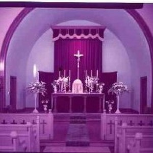 SERIES - two similar views of an unidentified church chapel altar with Easter lily and Calla and lily arrangements on the altar.