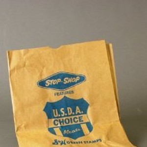 Brown paper grocery bag with blue text. "Stop-N-Shop USDA Choice"