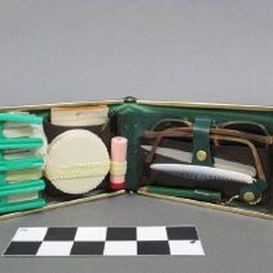 Purse (a), green plastic in original box. Contains personal items: comb (b), nail file (c), sunglasses (d), mirror (e), and compact (f). Laurita, "Carry-all" by Joell.
