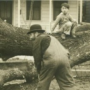 An unidentified man cutting a downed tree after the windstorm in February 1938. A small boy is sitting on the tree.
