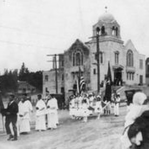 Photo--black and white: The Holy Ghost parade on Main Street Sebastopol, about 1900s. The Methodist Church is seen in background.