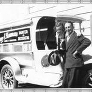 Photo--black and white: Larry Naumann and an unknown girl, 1936 with his business van advertising Larry E. Naumann Painter & Decorator. In 1924 Naumann Paint Store was awarded the contract to paint the Analy School busses.