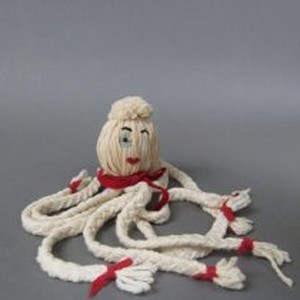 Plush toy octopus with braided yarn and felt trim.