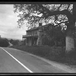 View of an abandoned, unidentified Gold Rush era building - a two-story hotel or residence made of stone and wood.