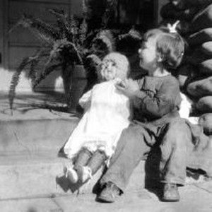Ester Dewey, Harold's daughter, holding her baby doll on the family porch, 1910s.