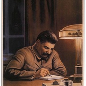 A posted dedicated to Joseph Stalin. Caption reads, "O kazhdom iz nas zabotitsia Stalin v Kremle / О каждом из нас заботится Сталин в Кремле", meaning, "In Kremlin, Stalin cares of everybody". [Description English/roman)]