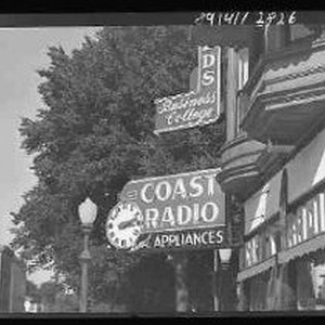Coast Radio at 900 J Street in the Ruhstaller Building; exterior of the upper portion of the building showing the neon sign.