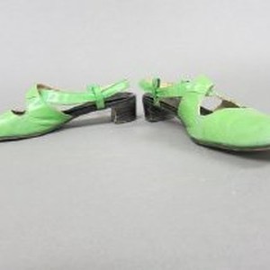 Women's light green leather sling-back pumps with square toes. Leather straps criss-cross over instep. Metal buckle on exterior side of sling strap. 1-1/2 inch continental heel. Label: "Angelinos of California."
