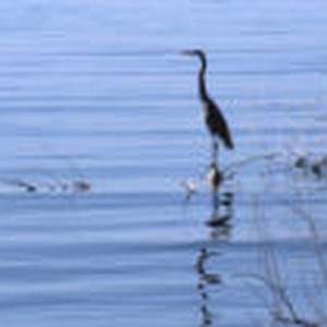 A heron perched on a branch that is sticking out of the water.