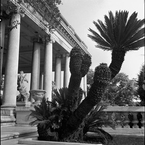 The cycas revoluta is also referred to as the sago palm. Label accompanying photographs in album reads "HEH 8 This specimen of Cycas revoluta (sago palm), native of Japan, is 300 years old. Terrace, Huntington Art Gallery. Loggia at left." Another version of this is no. 548 Pictures Archives, box 3, folder 5. MS note on verso reads "HEH 8 Feb 1938." Stamp on verso gives permission for the print to appear in "Exhaust." (?)