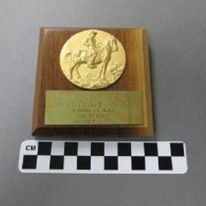 A horse show award plaque made of a small wood block with a brass plaque in which is engraved "Winchester G. Felt First Place Award Barn Class SHA Playday November 26, 1967". Mounted above the plaque is a medallion with a molded figure of a horseman in western gear astride a horse.