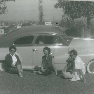 Ernestina Martinez (center) sits on grass between their sister-in-law (left) and brother (right) next to the family's blue and white 1948 Pontiac coupe, circa 1953.