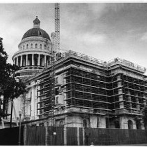 View of the California State Capitol building undergoing restoration. This view is showing the L Street side completely stripped of plaster (on the right) and the 10th Street side partially stripped.