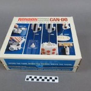 Ronson brand Can-Do, c.1950s , hand held mixer with detachable tools: can opener knife sharpner potato masher beater And includes cleaning brush, hanging rack, and box
