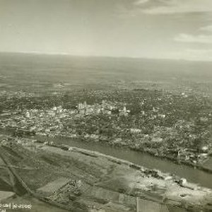 Aerial view of Sacramento's business district looking NE. Sacramento River and M Street Bridge in foreground.