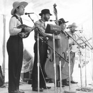 Four men dressed in western attire play the ukulele, base, acoustic guitar, and banjo. This stage performance includes Sourdough Slim on left.