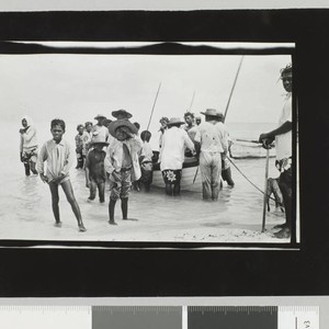 Men and boys on fishing outing. They stand in shallow water, some pull a rowboat to shore. Title and date transcribed from envelope. Copy print of original.