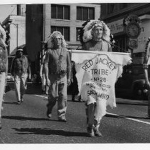 Exterior view of the "Red Jacket Tribe, No. 28: Improved Order of Red Men, Sacramento" as they march down K Street in a parade.