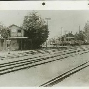 View of the southeast corner of 6th & E Street in 1902. Shown is a saloon train switching tracks a rail car, box cars and a rail yard building.
