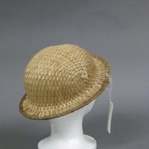 A "derby" style hat made of woven plant fiber and edged with a second type of plant.