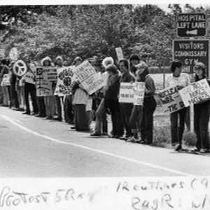 Members of the Sacramento Peace Center line the entrance to Mather Air Force Base to protest the MX missile.