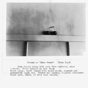 Photo--black and white: Identification of Luther Burbank cherry hybrid. Two cherries on stem without leaves. Typed botanical information attached to bottom of photo. Caption reads: "Cherry--"June Sweet" (Tree I-16) Tree fairly young with only five cheries, ripe 5-26-27. Fruit similar to Gov. Wood. Fruit large, heart shaped with round point, blushed and attractive light red. Suture all around, slightly prominent. Flesh soft, sweet, of very fine quality."