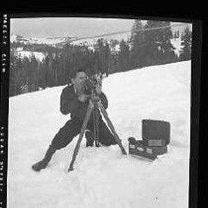 SERIES. Views of cameraman filming race, Views of skiers and of 5 skiers standing on slopes with a dog.