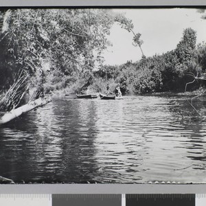 A pair of rowboats, each with two passengers, on the Russian River at the Chautauqua Camp Reverie. Title transcribed from folder. Date devised by cataloger. Copy print of original. Jack London lectured at Camp Reverie in 1901.