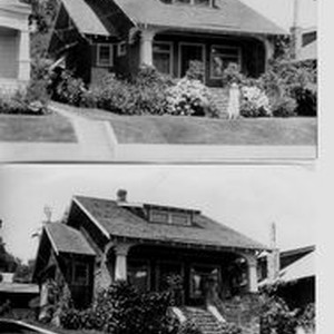 Photo--black and white: Two photos of the Charles Myers home at 7220 Bodega Avenue in Sebastopol. The house is a craftman style, shingle covered, large stone front porch. Mrs. Charles Myers stands in front of the house in the top picture. Charles Myers owned the Art Point Studios in Sebastopol from 1917 to 1966.