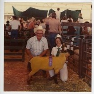 Henry Kloss (left) and Lori Heaney, American River 4-H (right) posed behind Lori's champion 4-H lamb. Mr. Kloss was the buyer at the 1974 livestock auction.