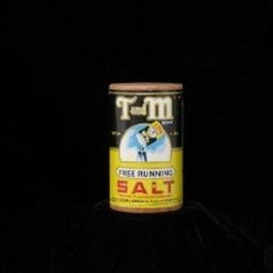 Salt container with "T & M Brand Free Running Salt" written on it.