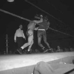 Carl Maxey boxing with inidentified boxer in ring. Referee is also visible in the ring.