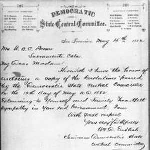 Photo of a letter and an "In Memoriam" resolution sent to Mrs. W.B.C. Brown from the Democratic State Central Committee after the death of her husband.