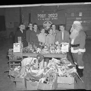 A group of unidentified teen-aged boys and Santa Claus standing behind a table on which are many toys. Posters on the table reads "Stock-N-Stomp Teen Age Dance........". They are in a hall and on the back wall is a banner "Post 2023 V.F.W. Post 8762".
