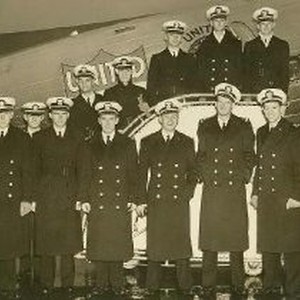 A Naval Officer's Class of midshipmen poses in front of a United Airlines plane, probably at the NY Municipal Airport. David Lester Cole is in front row at left end. Cole was the first Sacramentan killed in WWII.