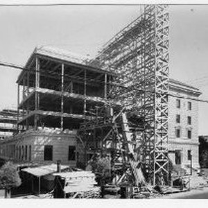 Exterior view of the construction site for the addition to the Sacramento Post Office and Federal Courthouse at 805 I Street between 8th and 9th Streets. This view is showing the 8th Street side to the addition, looking southeast.