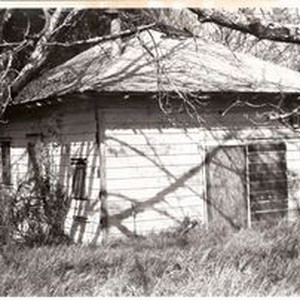 Photo--black and white: Luther Burbank cottage before renovations began in 1983. Door and window boarded up. Picture taken in circa 1978. Background: After Burbank died in 1926, Mrs. Burbank established an apple orchard on a portion of the Farm and leased the rest to Stark Bros. Nursery. When their lease expired in 1957 the property deteriorated and subsequently passed into new ownership. Local historians, intent on preserving the Burbank legacy in Sebastopol, formed the Western Sonoma County Historical Society in 1974. The cottage was placed on the National Register of Historic Places in 1978. The City of Sebastopol worked with the Society in its efforts to obtain 3 acres of the original farm and to restore the Cottage. Restoration began in 1983.