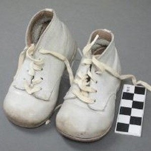 Child's white leather high-top oxford, flat sole, lace-up, round toe shoes. Five holes on each side of tongue contain white cotton laces with aglets. Label: "Edward's."
