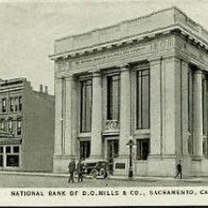 Oblique view of National Bank of D.O. Mills from street corner.