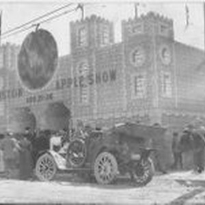 Postcard photo, black and white: The 1911 Gravenstein Apple Show main entrance with facade made to look like a stone or brick castle. The flags and exhibit tent are visible in the background. Numerous people stand in front of the entrance along with two vintage automobiles / cars.