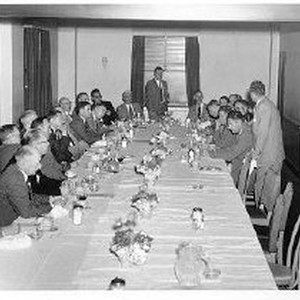 SERIES. Men at ASCE event seated at very long dining table in narrow room. Man stands to speak at far end.