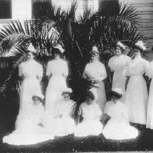 Ten nurses pose outside on the Central Pacific Railroad Hospital grounds.