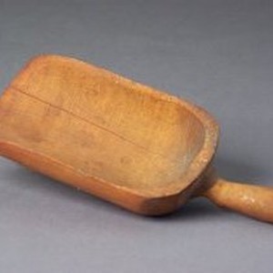 A large, plain wood scoop with turned handle and an eye hook on the end of the handle.