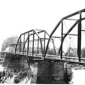Photo--black and white: The Duncans Mills bridge on the Russian River. The Duncans Mills bridge was originally a railroad bridge. The railroad track and bridge to Duncans Mills was a three rail system for both broad and narrow gauge trains. The broad gauge used the outer two rails, while the narrow gauge used the inner rail and one of the outer rails.