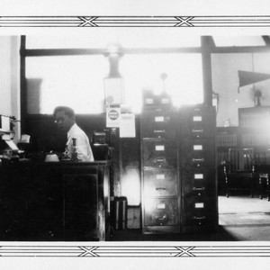 This is a photograph of an unidentified employee in Y. C. Hong's law office at 74 1/2 North Alameda St. in Los Angeles. Hong family papers. The Huntington Library, San Marino, CA.