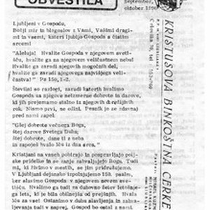 Bilten Kristove pentekostalne crkve u Ljubljani. Broj iz rujna - listopada 1990. godine koji sadrži kratak uvodnik, a zatim izvješća o tome što se događalo u crkvi tijekom kolovoza i obavijesti o tome što će se događati u crkvi tijekom rujna i listopada 1990. [Description (original non-English/roman language/script)] Bulletin of the Christ's Pentecostal Church in Ljubljana for September - October, 1990, containing an editorial, report on what went on in the church during August and the notices what will be been happening in the church in September and October 1990. [Description English/roman)]